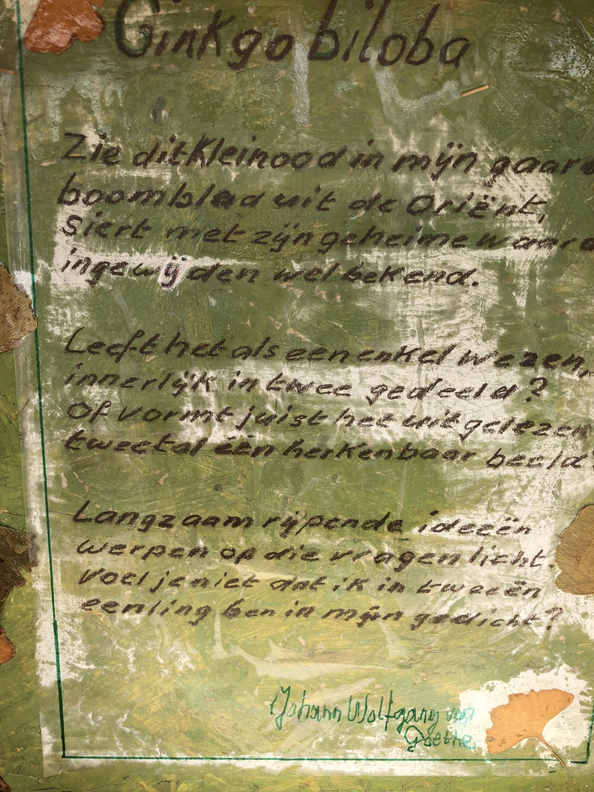 ‘We hebben elkaar nodig’, is de titel van dit werk van Marianne in Odeonpark. Prominent is het gedicht Ginkgo biloba van Goethe, die het blad van deze boom symbool maakt voor de eenheid en tweeheid van zichzelf, van geliefden, ...