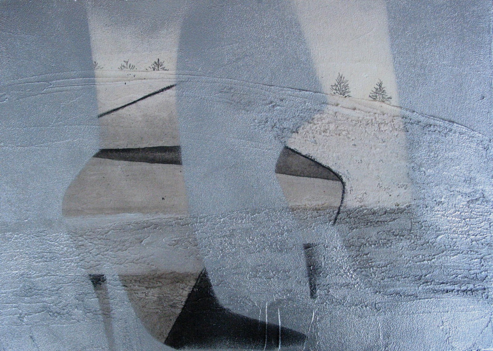 De hoge hakken stappen door een landschap waarop nog net te zien zijn; de contouren van Paviljoen De Verbeelding van Rene van Zuuk, de taluds met boompjes van Bas Maters Landschapspark, en een stukje muur van Richard Serra's Sea level